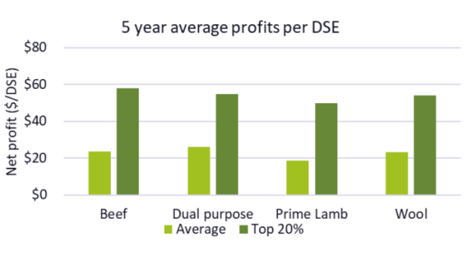 There is however a very big difference in profit within each livestock enterprise between the highest performing producers and average producers. This suggests there is far more to be gained by striving for excellence within a wool growing enterprise than delivering average performance in an alternative livestock enterprise.