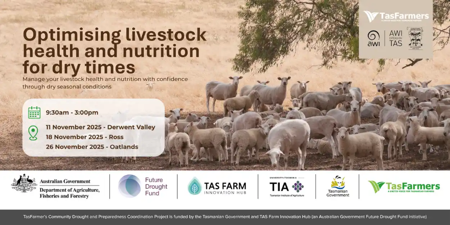 TasFarmers, TAS Farm Innovation Hub and AWI Extension TAS are pleased to invite livestock producers, farm staff and advisors to attend an Optimising livestock health and nutrition for dry times workshop.